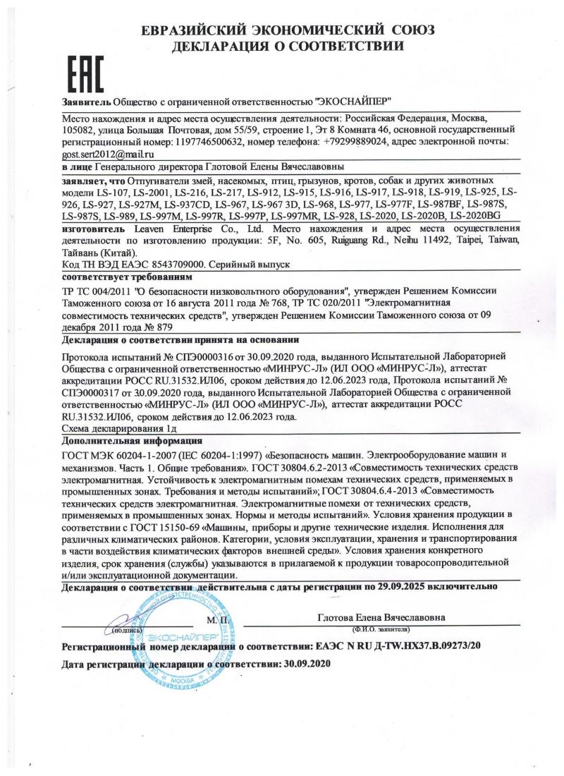 Отпугиватель птиц «Экоснайпер LS-2001»